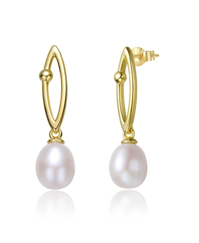 Sterling Silver 14k Yellow Gold Plated with Freshwater Pearl & Cubic Zirconia Oblong Marquise Drop Earrings