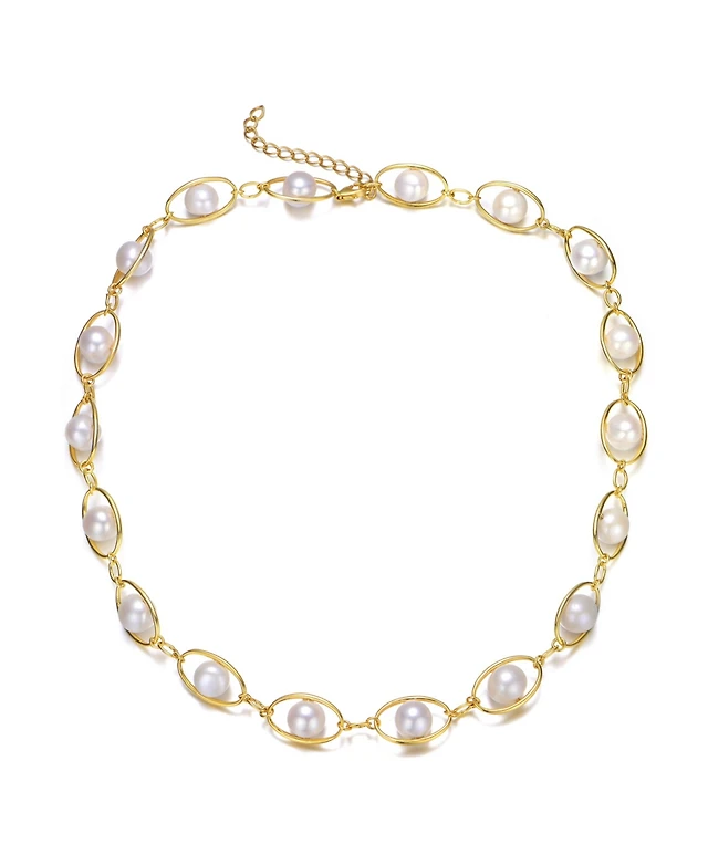 Sterling Silver 14K Gold Plated Genuine Freshwater Pearl and Cubic Zirconia Link Adjustable Necklace