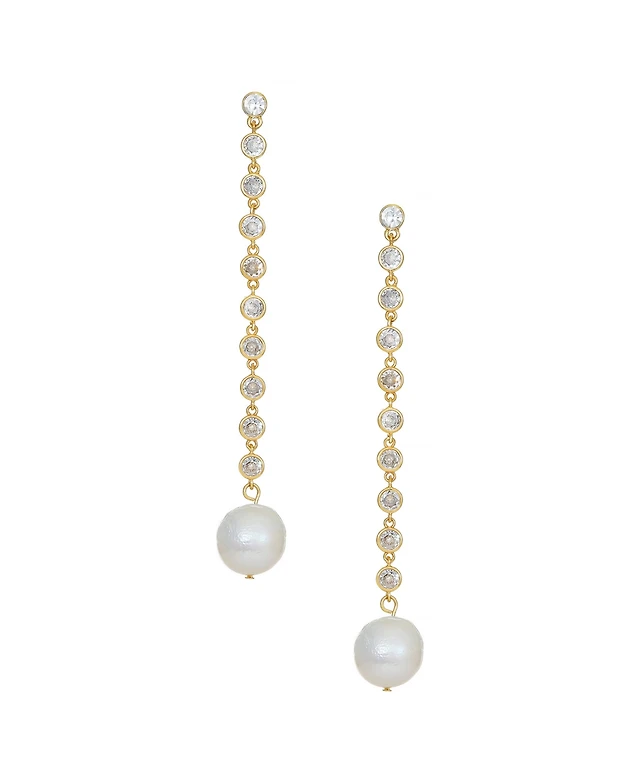 Gv Sterling Silver White Gold Plated White Round Freshwater Pearl with Clear Baguette Cubic Zirconia Drop Earrings
