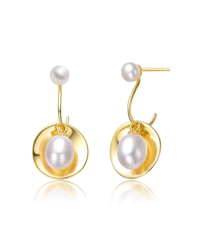 Sterling Silver 14k Yellow Gold Plated with Oval White Freshwater Pearl Seashell Design Double Dangle Earrings