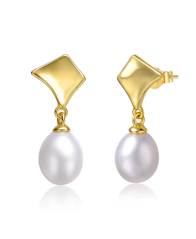 Sterling Silver 14k Yellow Gold Plated with White Coin Fresh water Pearl Double Dangle Square Earrings
