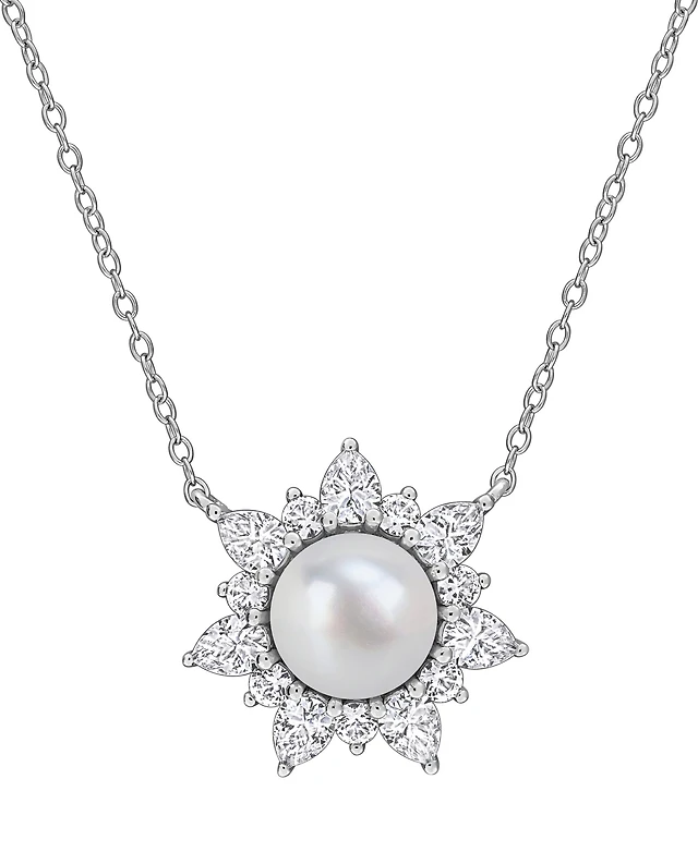 Cultured Freshwater Pearl (8mm) & Cubic Zirconia 18" Pendant Necklace in Sterling Silver