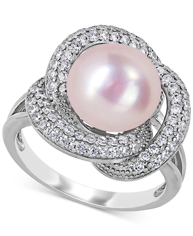 Pink Cultured Freshwater Pearl (10-1/2mm) & Cubic Zirconia Love Knot Stud Earrings in Sterling Silver