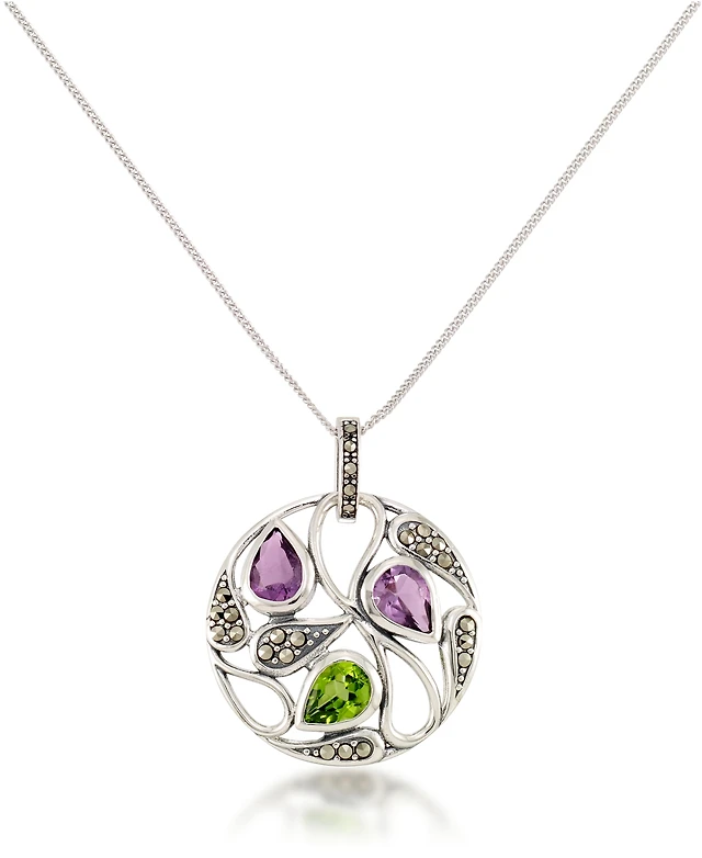 Marcasite and Amethyst ( 1-3/4 ct. tw.) and Peridot (2-5/8 ct. t.w.) Paisley Round Pendant +18" Chain in Sterling Silver