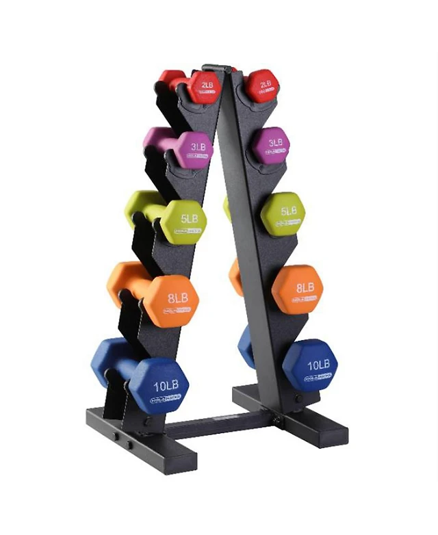 HolaHatha 5, 10, and 15 Pound Neoprene Dumbbell Weight Set with Storage Rack