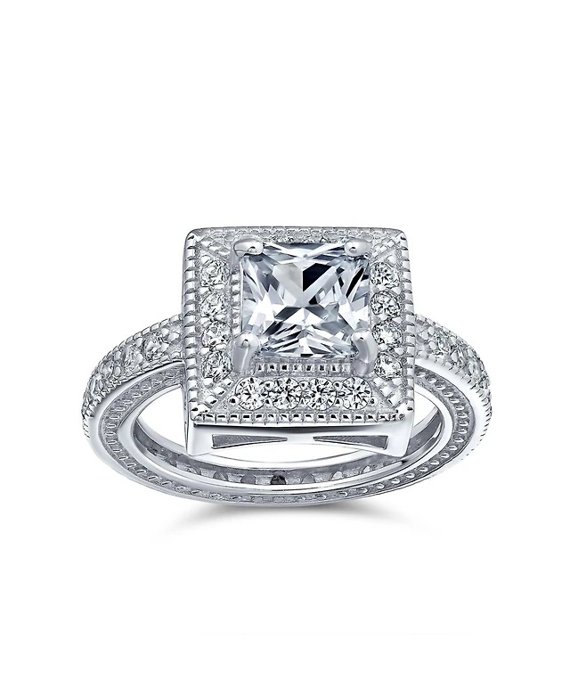 Bling Jewelry 2CT Art Deco Style Cubic Zirconia Milgrain Princess Cut Square Halo Cz Promise Ring With Eternity Band Sterling Silver