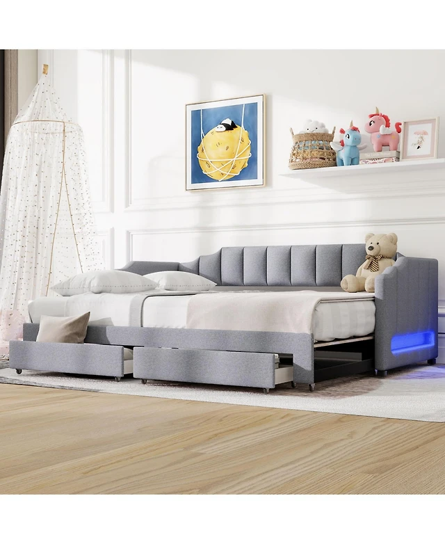 Upholstered Twin Xl Size Daybed with Led Belt and Trundle Gray