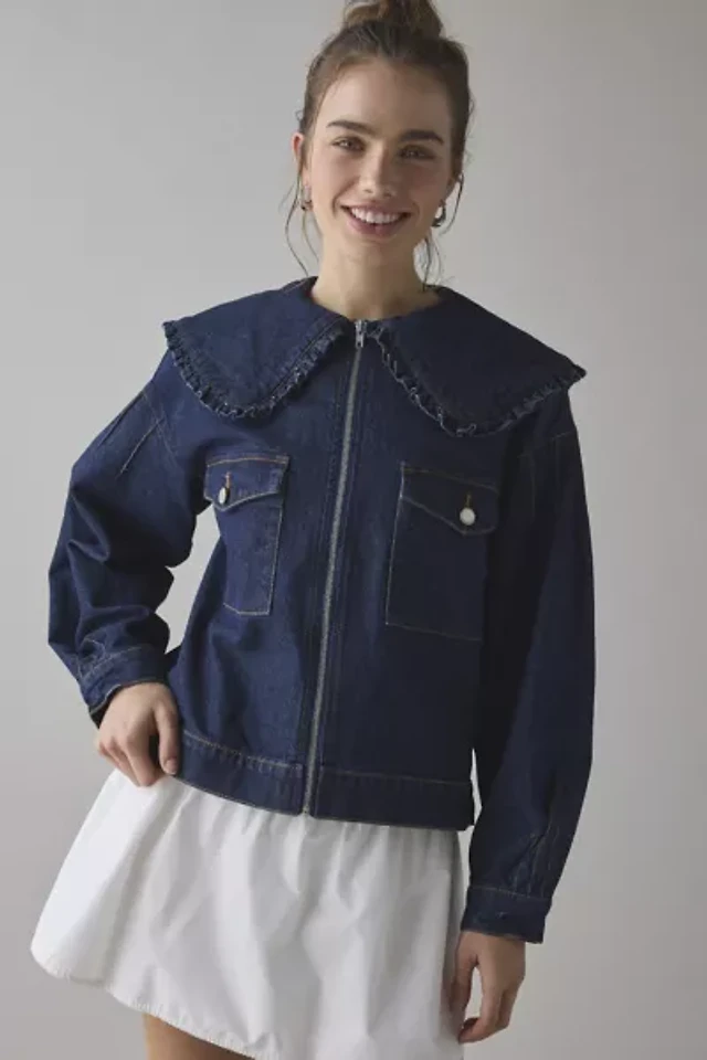 Petite Collarless Denim Jacket in Destructed Light Wash