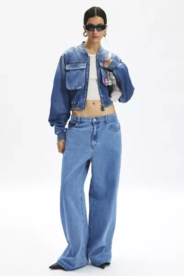 Edikted Womens Hooded Vintage Washed Denim Bomber Jacket