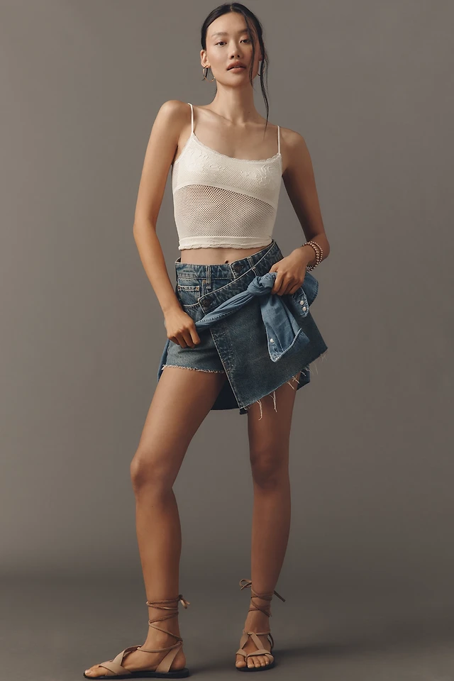 Low-Rise Light Wash Shoelace Denim Mini Skort