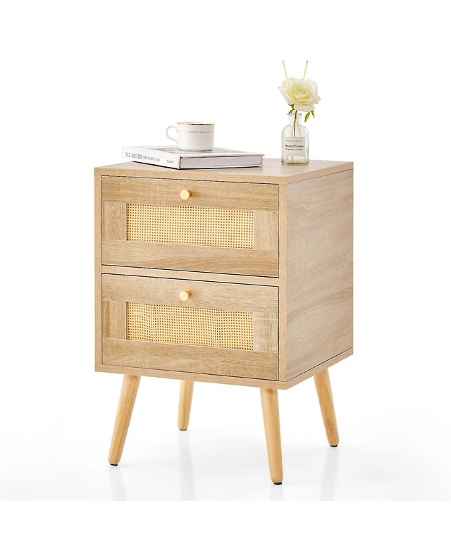 Slickblue Rattan Nightstand Boho Accent Bedside Table with 2 Storage Drawers