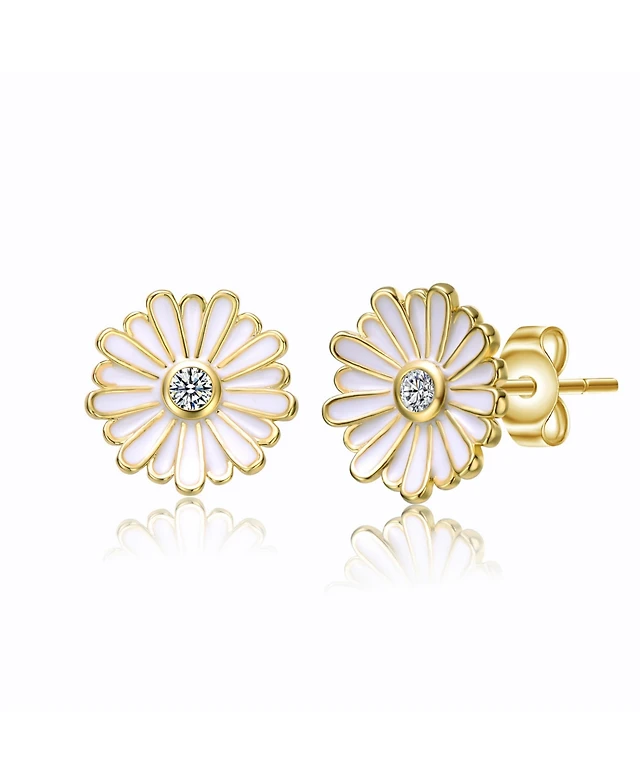 GiGiGirl Teens 14k Yellow Gold Plated with Cubic Zirconia White Enamel Blooming Daisy Flower Stud Earrings