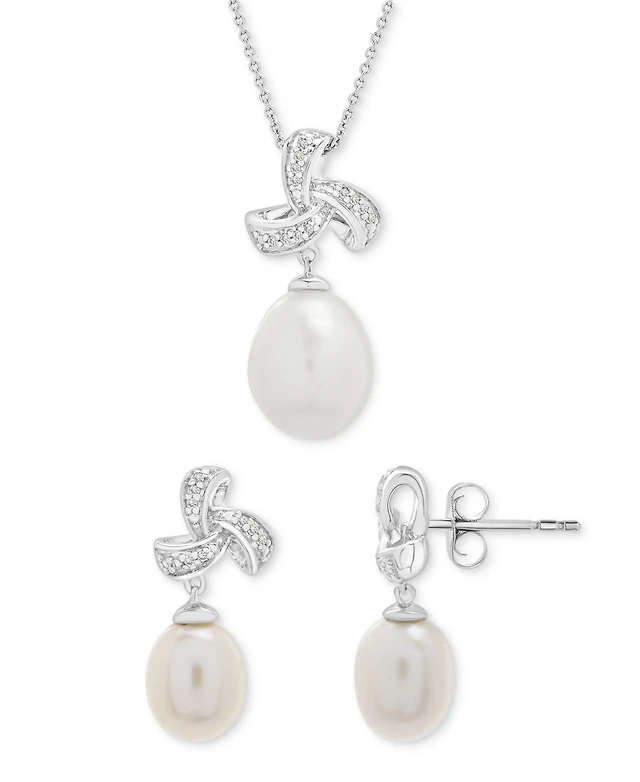 Cultured Freshwater Pearl & Diamond (1/10 ct. t.w.) Pendant Necklace & Drop Earrings Set in Sterling Silver
