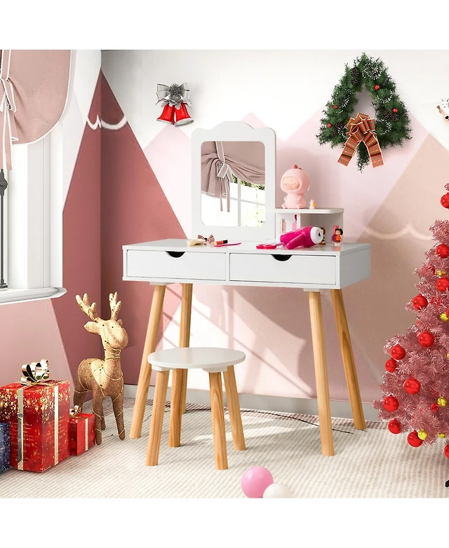 Famapy 5-Drawers White Makeup Vanity Table Wooden Dressing Desk With Mirror and 3-Tier Storage Shelves