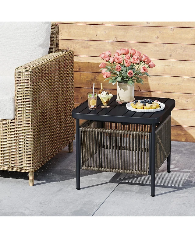 Flynama Outdoor Faux Wicker Side Table Powder Coated Iron Frame Grey Accent Table for Patio Extra Holding Space
