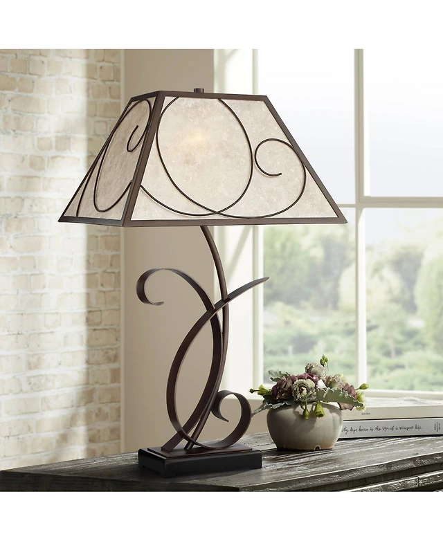 Teri Rustic Farmhouse Table Lamp 27" Tall Vintage like Brown Scroll Metal Light Mica Tapered Rectangular Shade for Bedroom Living Room House Home
