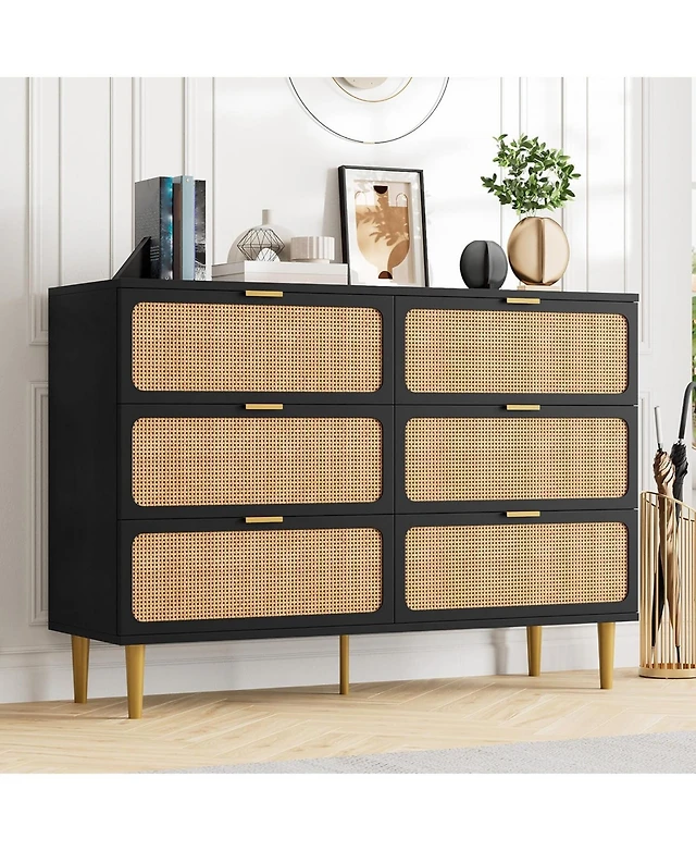 6 Drawer Dresser, Horizontal Chests Of Double Drawers For Bedroom, Mid Century Dresser With Black Handles And Wooden Legs, Storage Drawer Organizer Fo