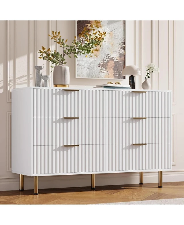 gaomon Oak Fluted 6 Drawer Dresser, Wide Wood Double Dresser with Metal Legs and Handles