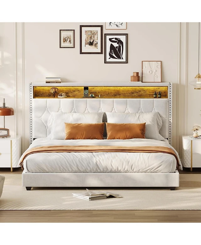 gaomon Bed Frame with Led Headboard for Kids, Sherpa Upholstered Platform Bed Frame with Wood Slat Support, No Box Spring Required