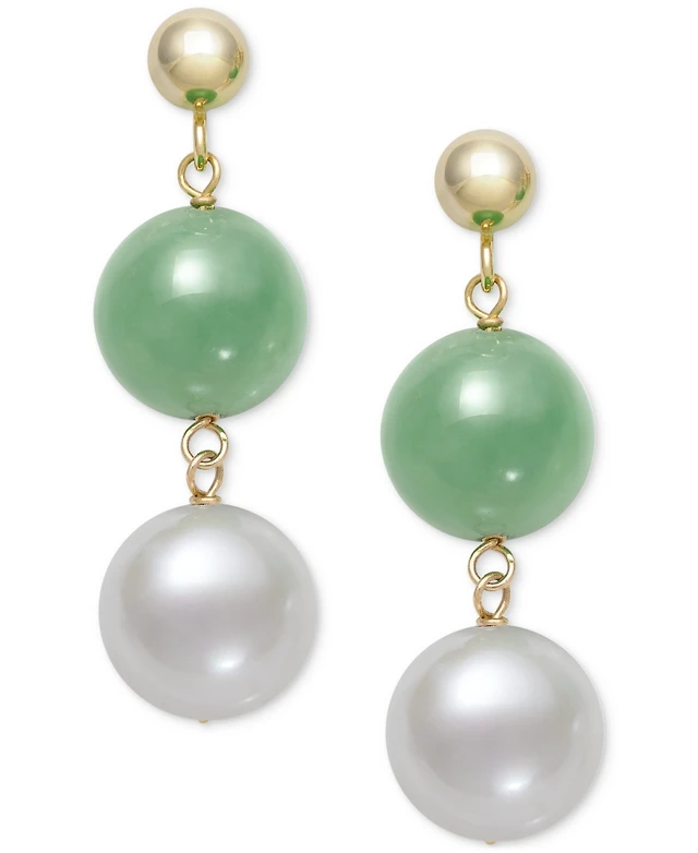 Dyed Green Jade & Freshwater Pearl (7-1/2mm) Double Drop Earrings in 10k Gold