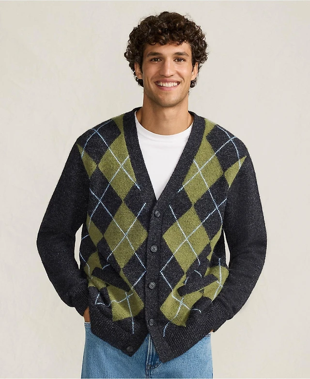 Lands' End Men's Long Sleeve Fuzzy Argyle Cardigan Sweater