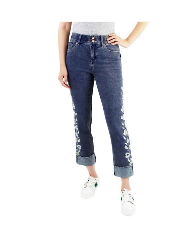 Indigo Poppy Women's Two Button Tummy Control Embroidered Wide Cuff Crop