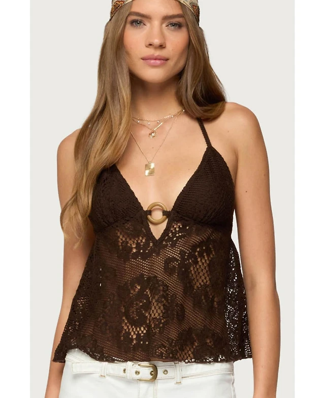Edikted Womens Sheer Crochet Babydoll Halter Top