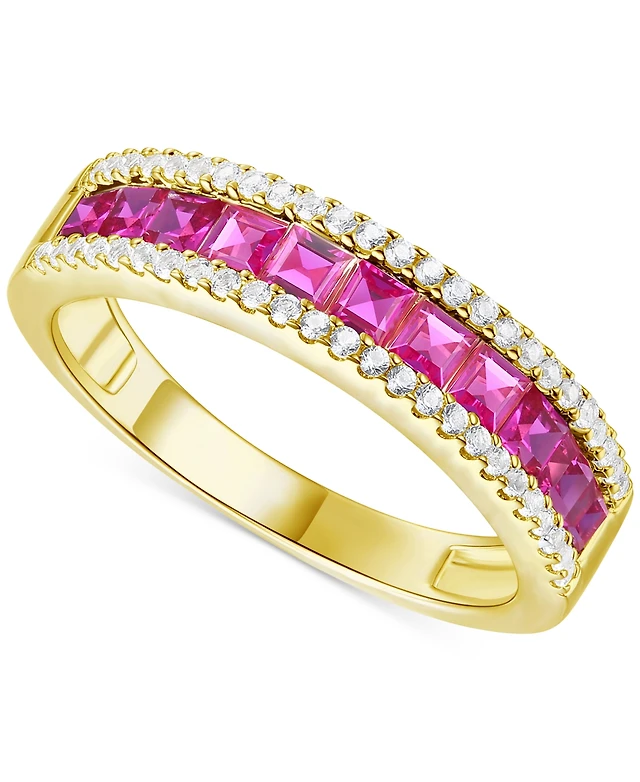 Princess-Cut Lab-Created Ruby and White Lab-Created Sapphire Triple Row Band in Sterling Silver with 14K Gold Plate