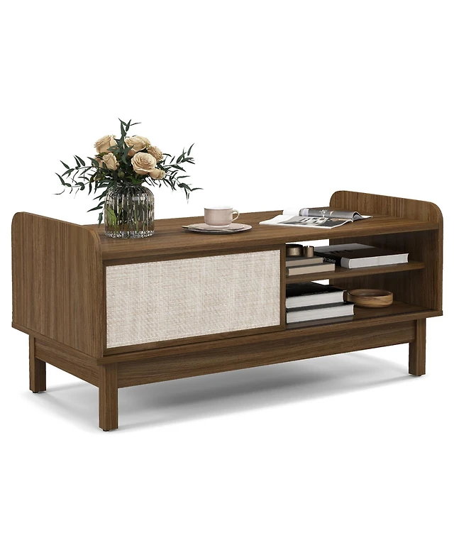 Gymax Rectangular Coffee Table w/ Storage Weaving Sliding Door & Adjustable Shelf