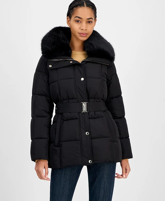 Michael Kors Women's Belted Hooded Faux-Fur-Collar Puffer Coat, Exclusively at Macy's