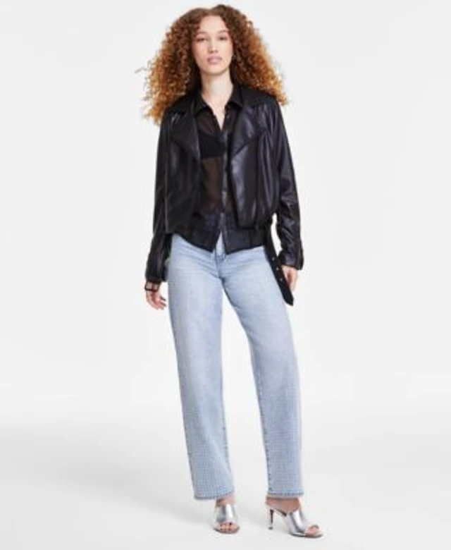 Sebby Women's Faux-Leather Vintage-Wash Bomber Jacket