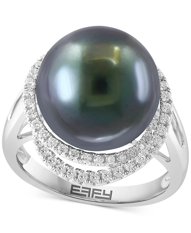 Effy Black Tahitian Pearl (13mm) & Diamond (1/4 ct. t.w.) Double Halo Statement Ring in 14k White Gold