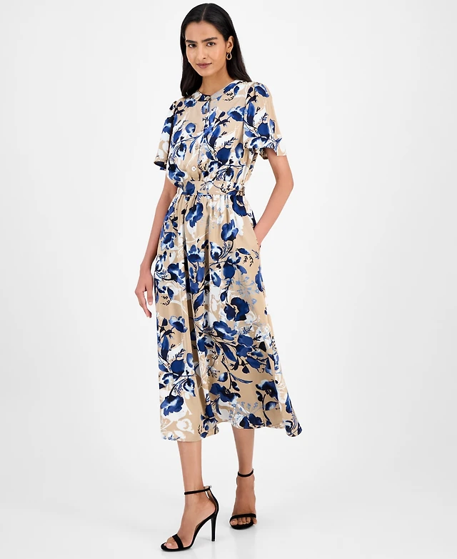 Mac DuggalWomen's Floral Print Cap Sleeve Satin Midi Dress