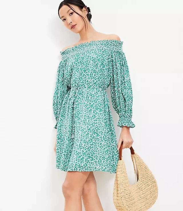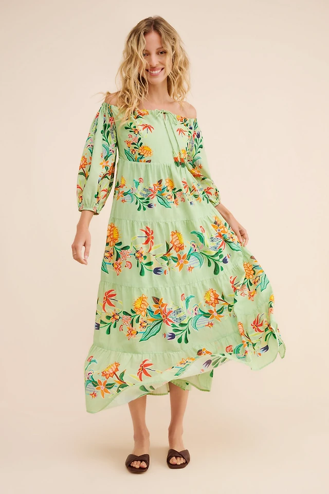 FARM Rio Off-The-Shoulder Long-Sleeve Tiered Floral Midi Dress