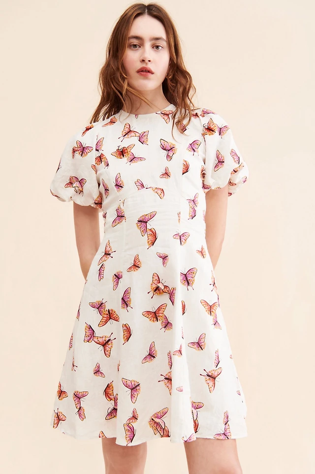 Lovaan Hollie Linen Silk Puff-Sleeve Dress