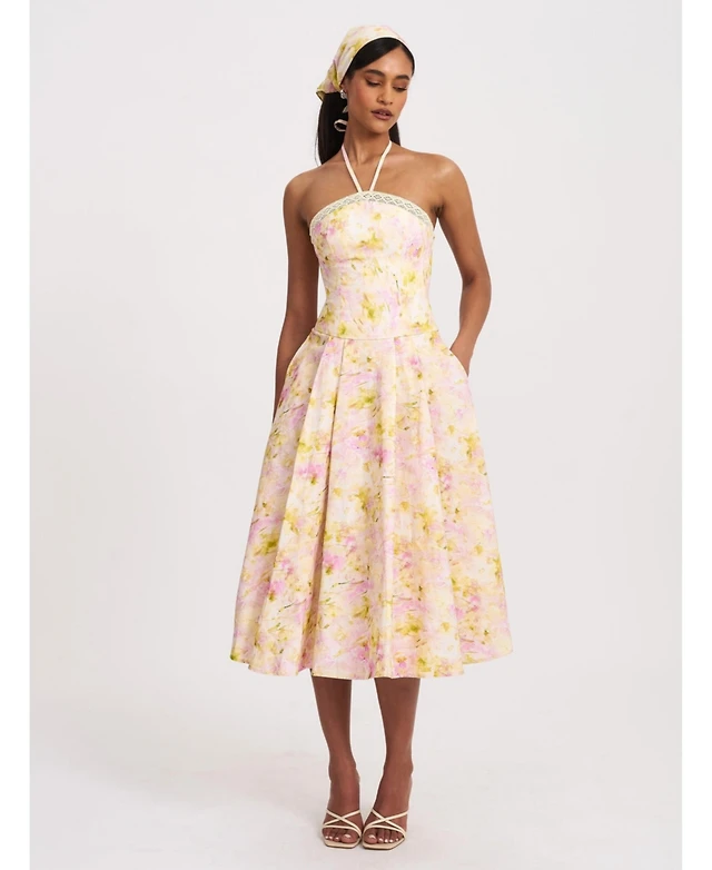 Miss Circle Women's Taleah Blue Floral Print Linen Mini Dress with Lace Trim