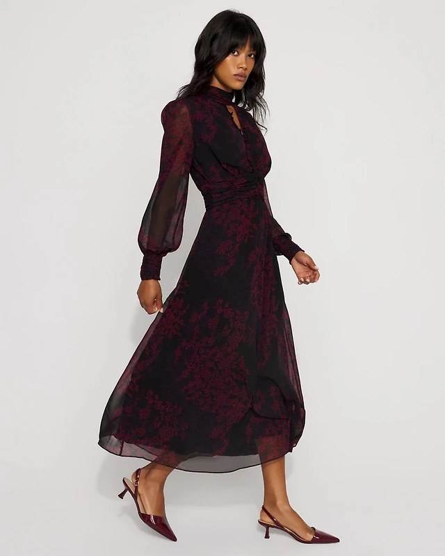 Satin V-Neck Puff Sleeve Tie Front Cutout Maxi Dress