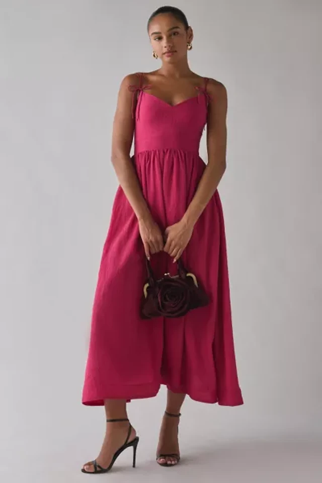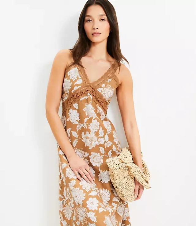 Petite Floral Lace Trim Linen Blend Midi Dress