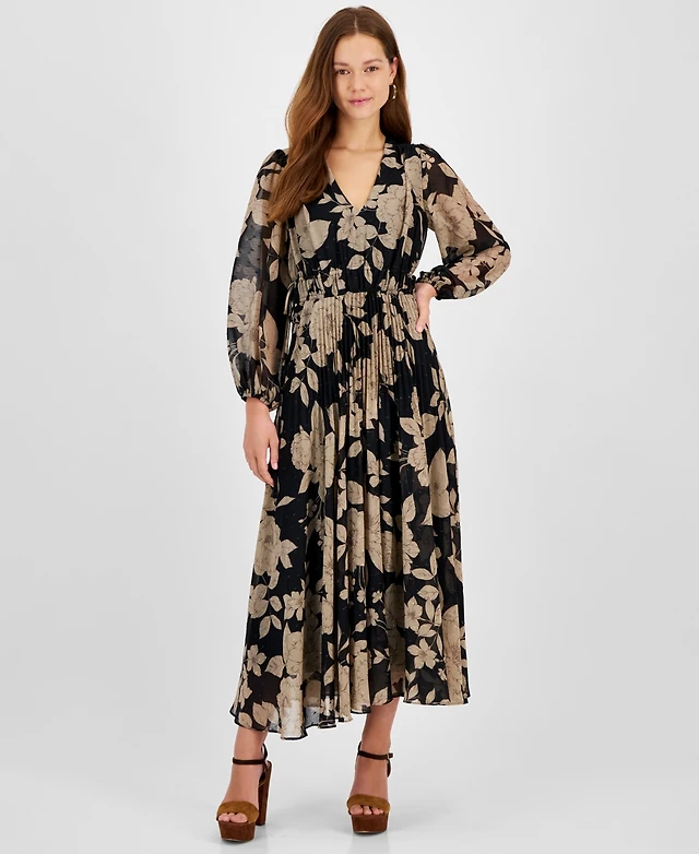 Taylor Women's Floral Chiffon V-Neck Pleated Dress