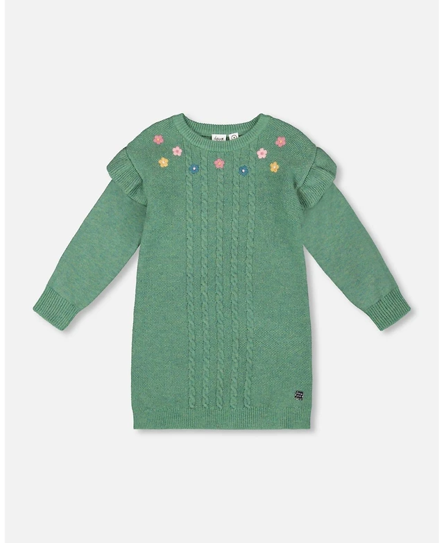 Deux par Toddler Girls Knitted Dress Sage Green with Ruffles and Floral Embroidery - Toddler|Child