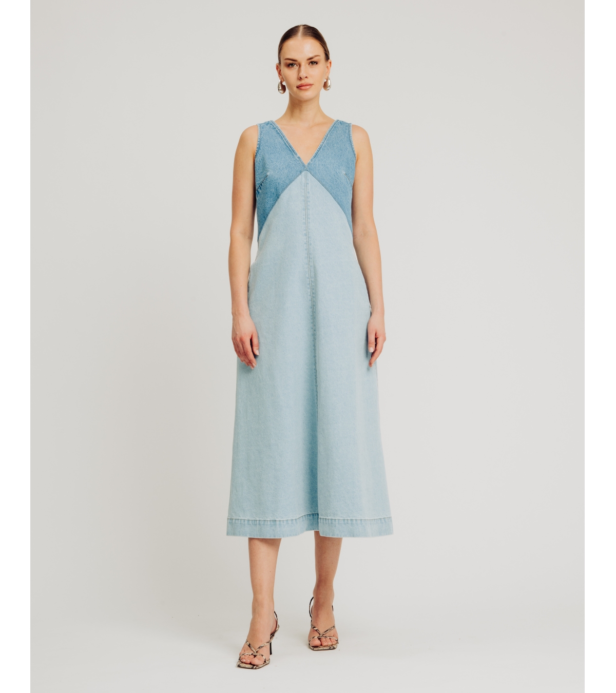 Miss Circle Women's Paloma Blue Print Linen Corset Draping Top Midi Dress