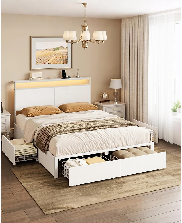 Hausource Modern Queen Size Bed Frame with 4 Storage Drawers & Led Headboard & Charging Station