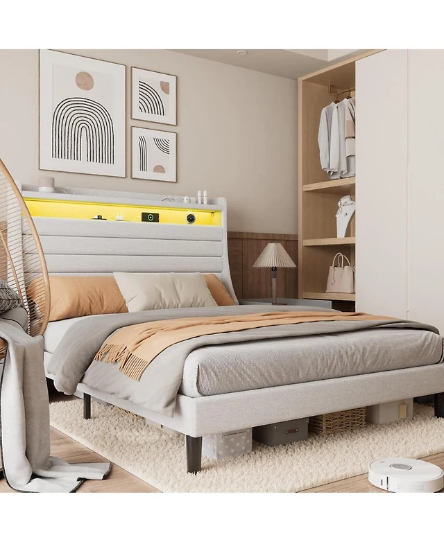 Gaomon Floating Upholstered Bed Frame with Rgb Led Lights, Charging Station