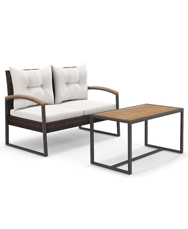 Gymax 8PCS Patio Acacia Wood Furniture Set Pe Rattan Conversation Set w/ Off White Cushions