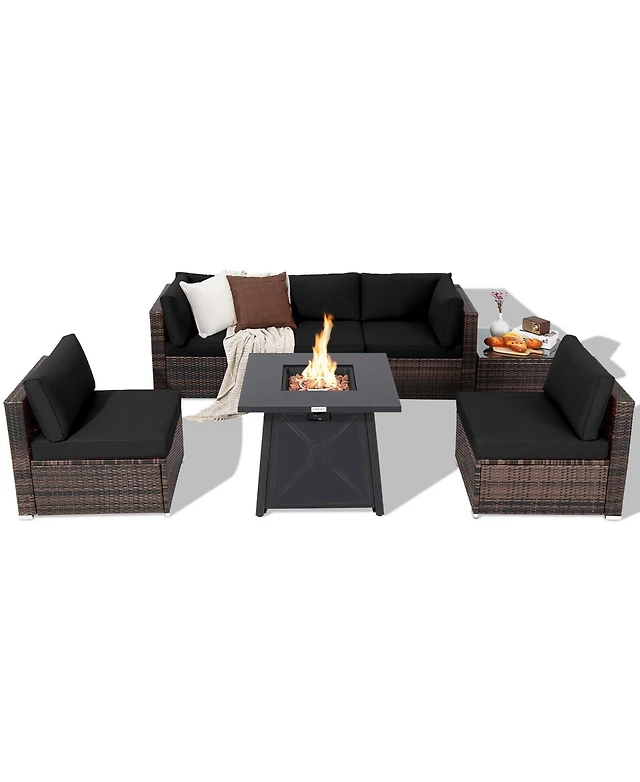 Gymax 7PCS Rattan Patio Sectional Furniture Set w/ 30'' Fire Pit Table & Cushion