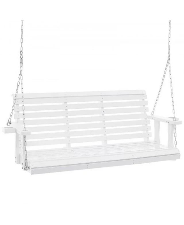Patio Wooden Swing Chair, Hanging Porch Swing Bench with Cushion&Pillows, 10.8Ft Hemp Ropes for Garden,Backyard, Lawn,White