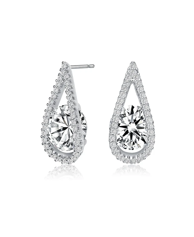 Sterling Silver with White Gold Plated Clear Round Cubic Zirconia Pear Frame Halo Earrings