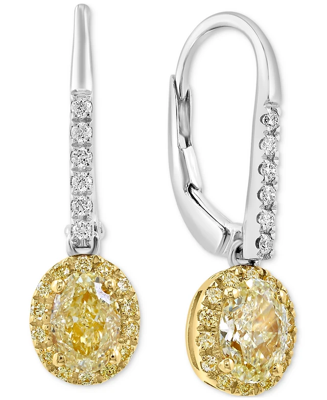 Effy Yellow Diamond (1-1/10 ct. t.w.) & White Diamond (1/10 ct. t.w.) Oval Halo Leverback Drop Earrings in 18k Two-Tone Gold