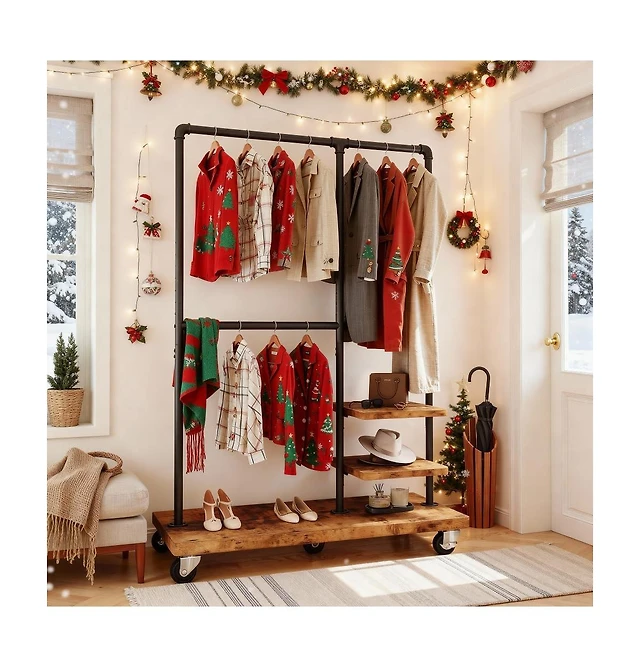 Raybee Clothes Rack, Heavy Duty Clothing Rack, Industrial Pipe Clothes Rack with Shelves, Rolling Garment Rack for Bedroom, Retail Store, Rustic
