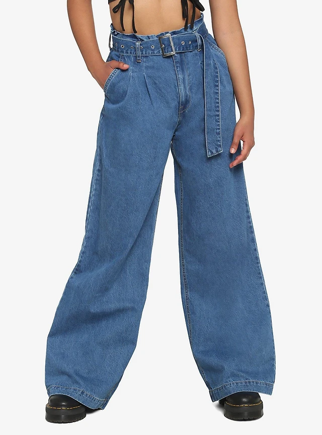 Wide Leg Grommet Belt High-Waisted Denim Pants